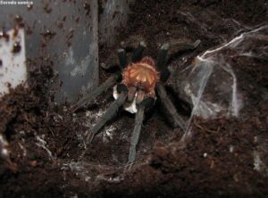 Samice zazwyczaj dorastają do ~6 cm DC, z rozpostartymi odnóżami natomiast do ~12 cm. Samce są rzecz jasna mniejsze, i smuklejsze. Karapaks kremowo-złotawy, z czarnymi liniami rozchodzącymi się promieniście. Odwłok czarny częściowo pokryty kremowymi włoskami. Odnóża gęsto owłosione długimi matowo-pomarańczowymi włoskami (najbardziej trzecia, i czwarta para). Niektóre segmenty odnóża oddzielone są żółtą obręczą.